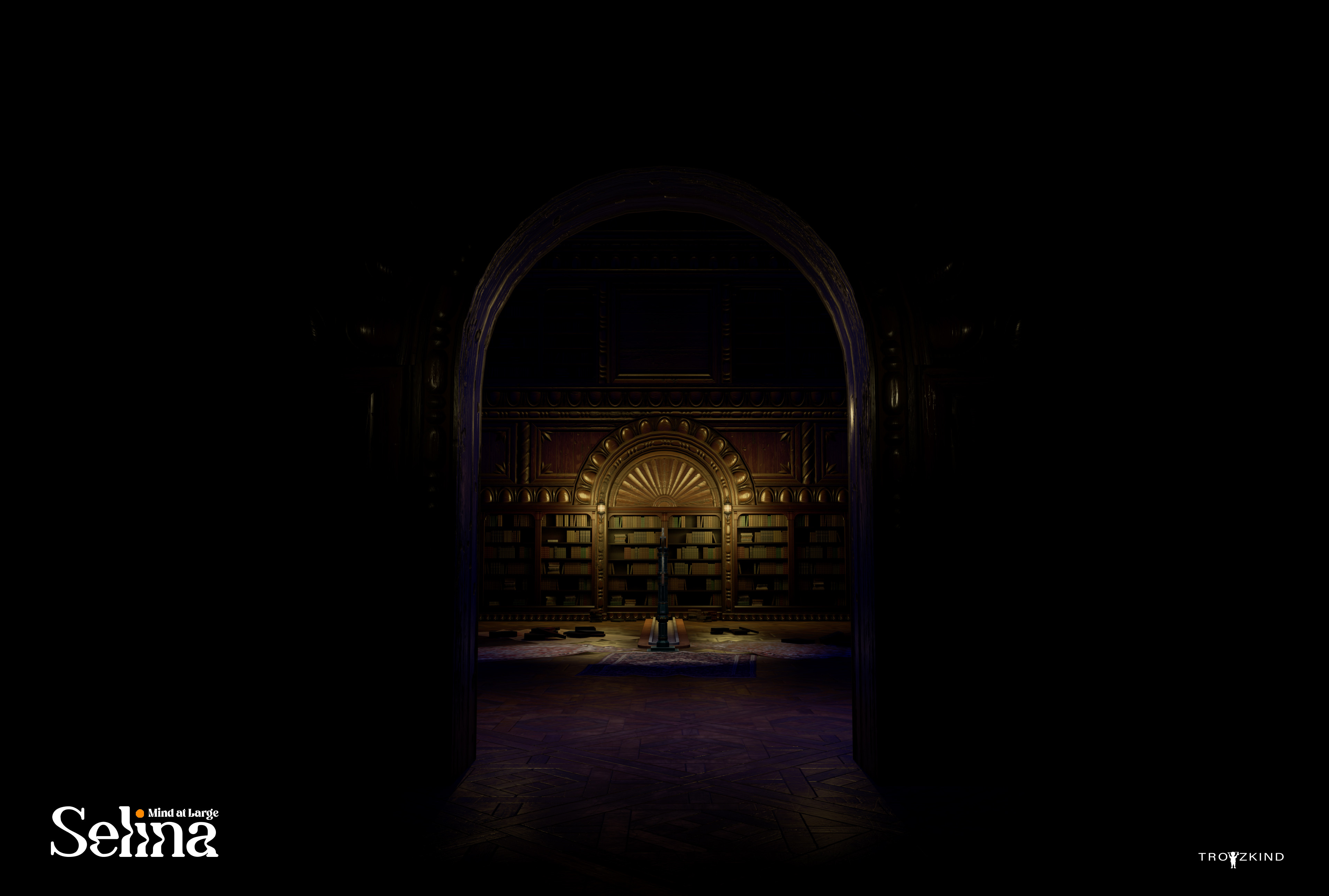 This scene marks the player's entry into the game world, initiating the narrative and core mechanics. The experience begins in a grand, dimly lit library, an atmosphere designed to be simple and spacious to avoid overwhelming players who might be experiencing VR for the first time. The setting, characterized by towering bookshelves and dramatic shadows, focuses the player's attention on the crucial starting point. The player is subtly guided toward a green water pump, and only once they activate it does the Narrator appear to introduce the story. From there, the player is led through three distinct tutorial areas designed to naturally integrate them with the game's systems and underlying lore.