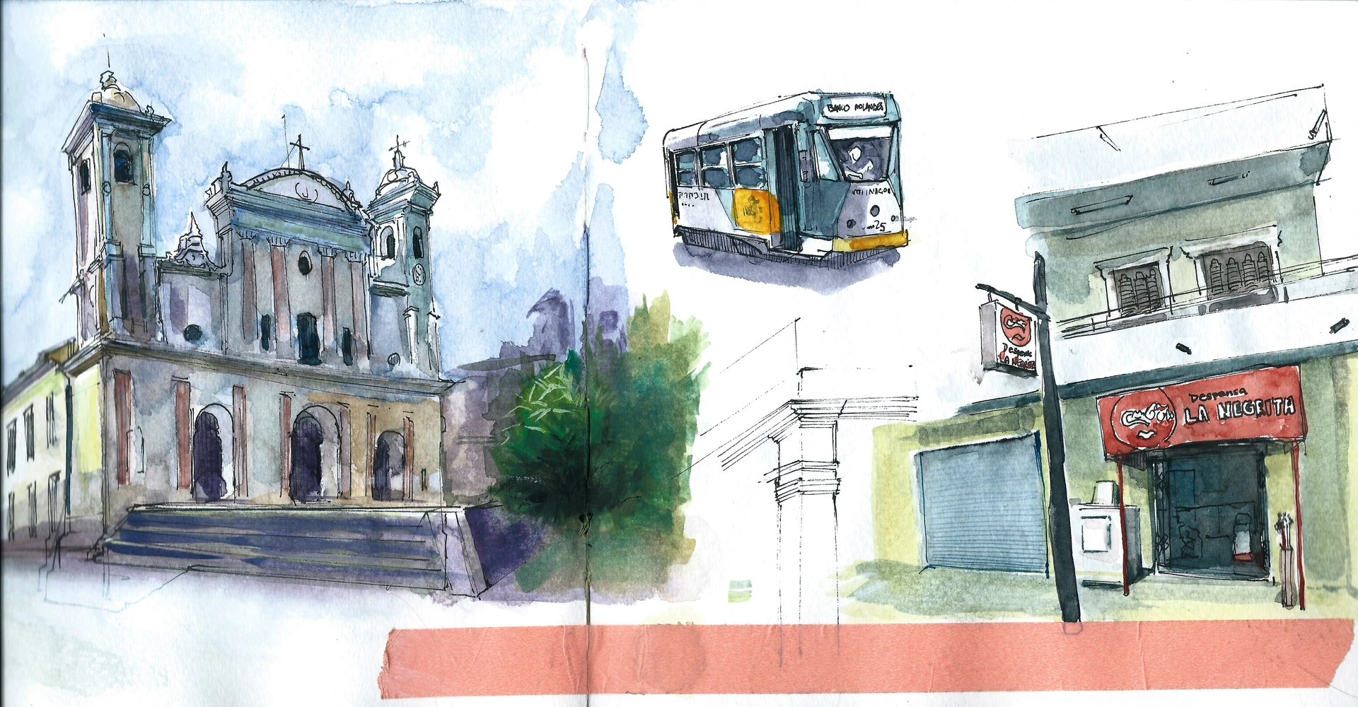 Buses in Asuncion. Fountain pen and Watercolor
